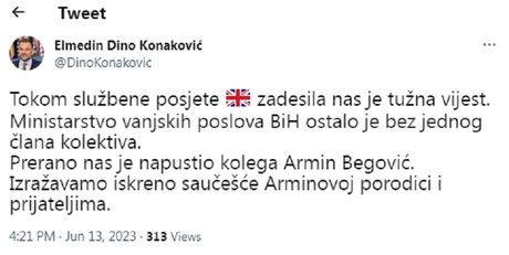- Tokom službene posete Velikoj Britaniji zadesila nas je tužna vest. Ministarstvo spoljnih poslova BiH ostalo je bez jednog člana kolektiva. Prerano nas je napustio kolega Armin Begović. Izražavamo iskreno saučešće Arminovoj porodici i prijateljima - napisao je Elmedin Konaković.