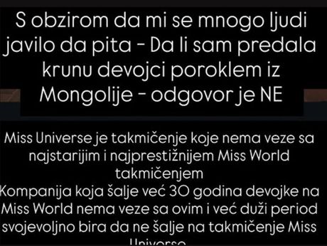 - Evo i ja da se oglasim jer previše pitanja dobijam na ovu temu. S obzirom da mi se mnogo ljudi javljalo da pita da li sam predala krunu devojci iz Mongolije, odgovor je ne. Miss Universe je takmičenje koje nema veze sa Miss World takmičenjem - poručila je Aleksandra.