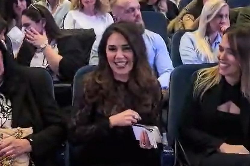 Aleksandra je nasmejana došla da podrži supruga iz prvog reda a na sebi je imala midi čipkanu crnu haljinu koja joj je savršeno pristajala dok je kosu raspustila.