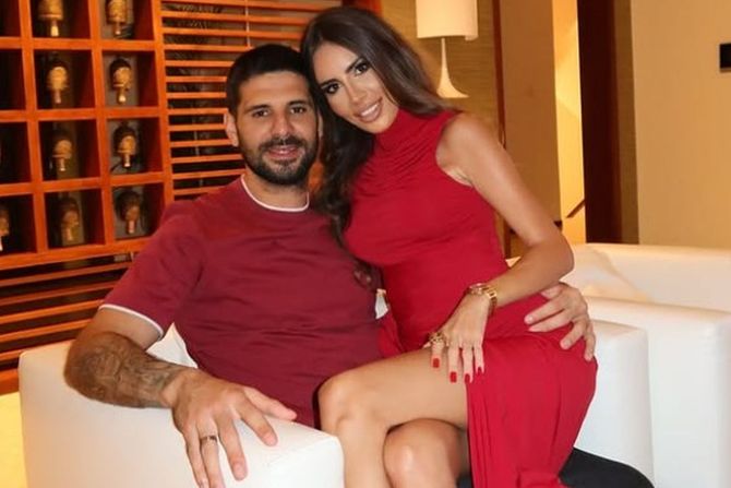 Mitrović joj drži ruku na: Fudbaler sa suprugom i decom slavio Novu godinu, Kristina grmela u crvenoj haljini