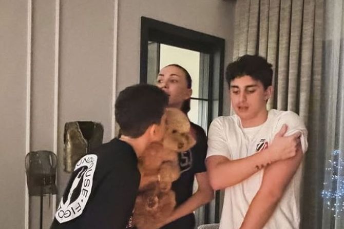 Na jednoj od slika, drži svog psa u naručju, dok su sinovi pored nje, a ispred njih torta sa upaljenim svećicama.
