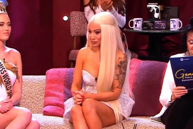 Voditeljka Pinka na sebi je imala kratku dekoltiranu haljinu, te visoke potpetice, ali i periku dužine skroz do zadnjice.