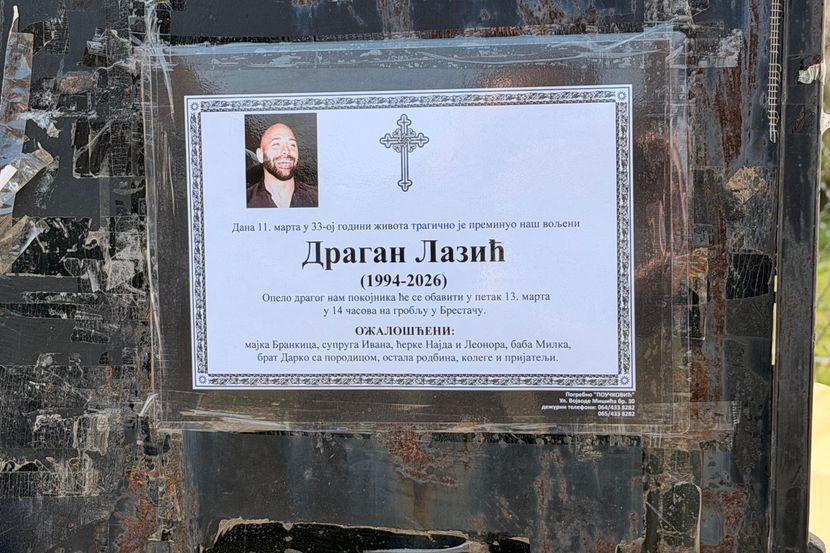"Dana 11. marta u 33-oj godini tragično je preminuo naš voljeni Dragan Lazić. Opelo dragog nam pokojnika će se obaviti u petak 13. marta u 14 časova na groblju u Brestaču. Ožalošćeni: majka Brankica, supruga Ivana, ćerke Najda i Leonora, baba Milka, brat Darko sa porodicom, ostala rodbina, kolege i prijatelji", piše na umrlici.