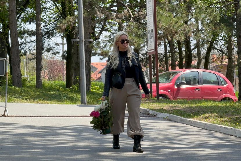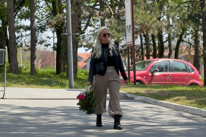 Bila je obučena u crnu majicu i crnu jaknu, dok je u donjem delu imala braon pantalone. U rukama je nosila cveće, a na glavi je imala tamne naočare za sunce.