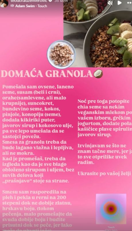 Ona je naime, objasnila da redovno kombinuje voće sa žitaricama, te da postoji i obrok koji se zove domaća granola, a koju redovno konzumira.