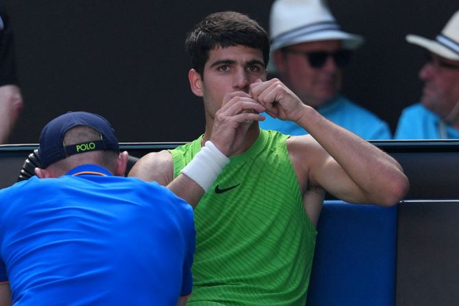 Alkaraz je sigurno išao ka pobedi, jer je vodio sa 2:0 u setovima, ali se u trećem setu povredio i imao ozbiljnih fizičkih problema.