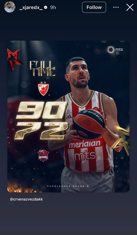 Naime, on je odmah posle meča na društvenoj mreži Instagram postavio sliku rezultata i tako stavio do znanja da je već gledao svoju ekipu i bio oduševljen onim što je video na parketu Beogradske Arene.
