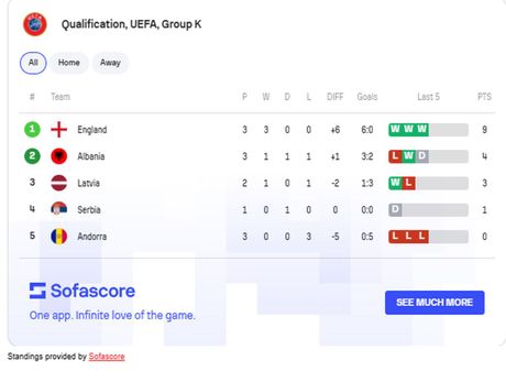 Važno je napomenuti da su neke selekcije odigrale tri, neke dva meča, a Srbija je odigrala samo ovaj sa Albanijom. Tako, na vrhu tabele nalazi se Engleska sa maksimalnih devet bodova i gol-razlikom 6:0, zahvaljujući tri ubjedljive pobede. Albanija zauzima drugo mesto sa četiri boda – ostvarenim kroz jednu pobedu, jedan remi i jedan poraz, uz gol-razliku 3:2. Letonija je treća sa tri boda iz dve odigrane utakmice, dok je Srbija, sa samo jednom odigranom utakmicom i bodom osvojenim u remiju bez golova, trenutno četvrta.