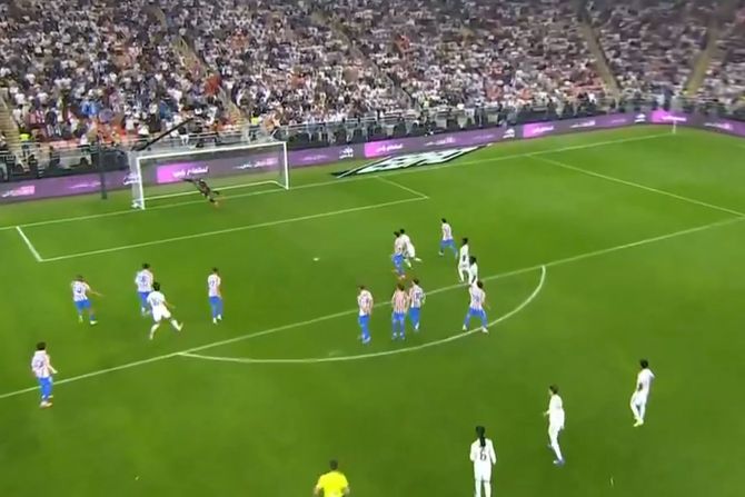 Dosuđen je slobodan udarac na nekih 25 metara od gola, Fede Valverde je stavio tu loptu, uhvatio je kratak zalet i raspalio je po lopti koja je prošla kroz živi zid. Jan Oblak, inače dečko naše teniserke Olge Danilović, ispružio se koliko je dugačak i samo je vrhovima prstiju uspeo da zakači ovaj šut.