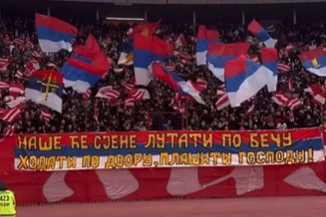 Razvijen je transparent "Naše će sjene lutati po Beču, hodati po dvoru, plašiti gospodu", a onda zapevali pesmu "Dok se zemlja oko sunca kreće zvezdini se huligani umiriti neće, zveče štangle sekire i lanci evo idu cigani ludaci".