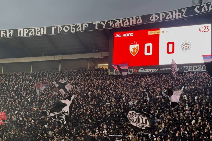 Južna tribina je u potpunosti ispunjena navijačima Partizana, a u jednom momentu su Delije odlučile da iznad severne tribine podignu transparent i isprozivaju Grobare.