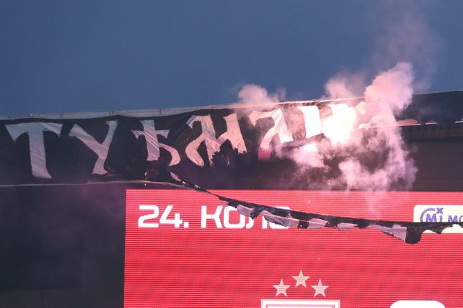 Žestok početak 178. večitog derbija između Crvene zvezde i Partizana i na terenu i van njega. Na jednoj strani žestoka borba se vodi na terenu, a van njega navijači u prvom planu.