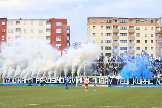 Delije prešle veliki put da bi u prvom minutu bacili baklju na protivničke navijače. Trebalo je utakmicu prekinuti pa da FSS odluči šta dalje.