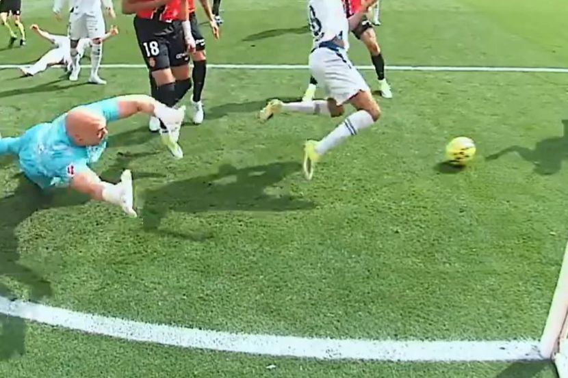 Uspeo je Dmitrović da se vrlo brzo zatim ponovo baci na drugu stranu i da spreči novi udarac, ali je lopta i dalje ostala baš ispred njega.