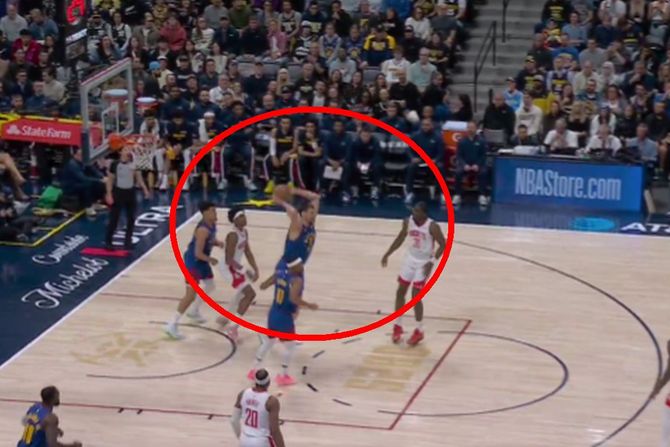 Nikola Jokić je još jednom pokazao zašto je jedan od najboljih igrača današnjice. Već na 1:50 do kraja prve četvrtine, kada je Denver imao samo 21:20, Jokić je uhvatio loptu ispod svog koša i “iz prve” sa dve ruke poslao savršenu asistenciju ka Kristijanu Braunu, koji je istrčao kontru i postigao poene. Potez je ostavio igrače Hjustona zatečene – samo su nemo pratili jedno od najboljih dodavanja ove sezone u NBA ligi.