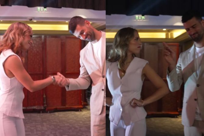 U pitanju je Džoli Šarp, koja je želela da pokaže svima kako se igra tenis i udara forhend, a onda se iza nje pojavio Novak Đoković, koji je pokazao kako to treba pravilno da se izvede.