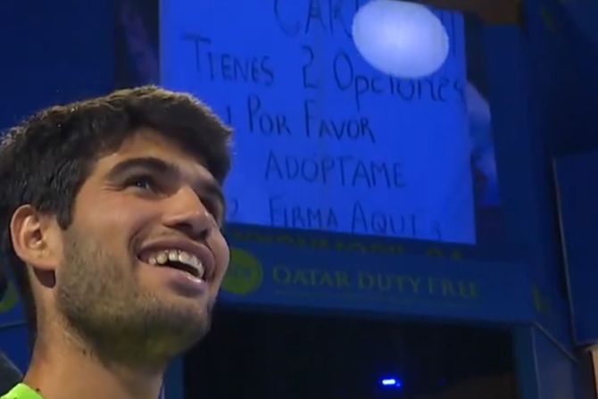 Taj trenutak nije prošao nezabeleženo, pošto je kamera ubrzo uhvatila pomenuti transparent, dok je i Karlos Alkaraz imao zanimljivu reakciju kada ga je ugledao. Primetio je Španac i iz srca se nasmejao, a nije poznato da li je mladom fanu ispunjen drugi zahtev, dok je prvi doista komplikovaniji.
