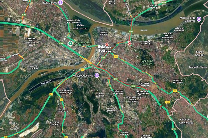 Naime, saobraćajne mape prikazuju zastoje kako kod Pupinovog mosta, tako i duž Novog grada i to u oba smera, a zastoj je i u Cara Dušana.