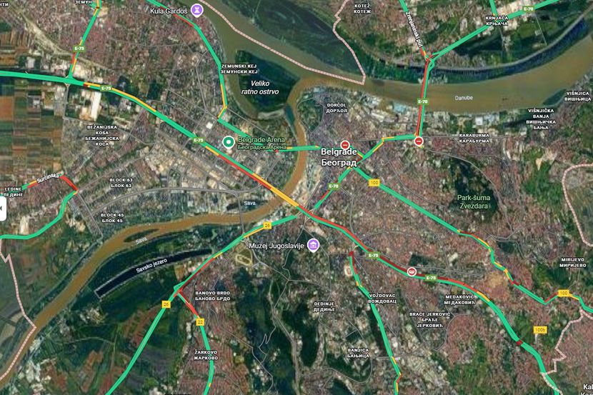 Stanje se malo popravlja dolaskom na Gazelu i prelaskom mosta. Mape prikazuju pojačan broj vozila, ali i prohodnost.