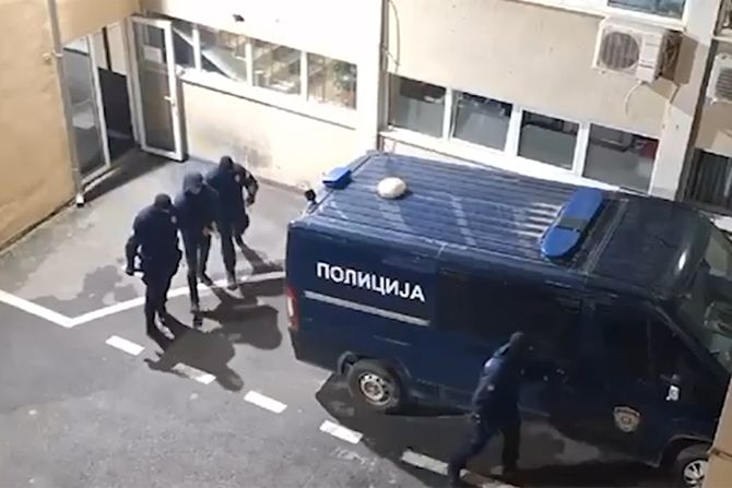Oni su, sa lisicama na rukama, bili privedeni od strane UKP, prvo u policijska vozila, a potom su, pod punom rotacijom, sprovedeni u policijsku stanicu.