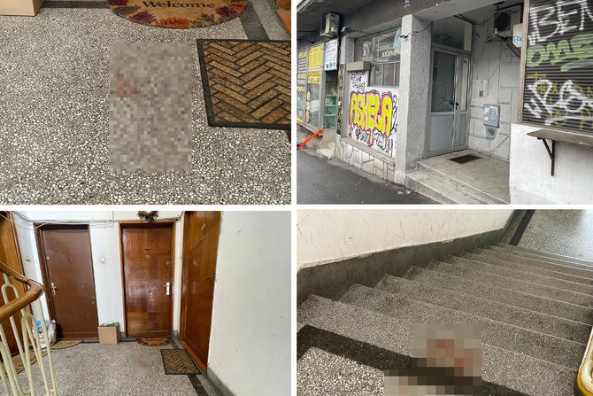 Iako je unutar stana uviđaj završen, tragovi borbe i povređivanja vidljivi su i van četiri zida. Ispred samih ulaznih vrata, ali i duž celog hodnika zgrade, naša ekipa primetila je brojne mrlje od krvi, što ukazuje na to da je ranjeni čovek verovatno pokušavao da izađe i potraži pomoć nakon što je uboden.