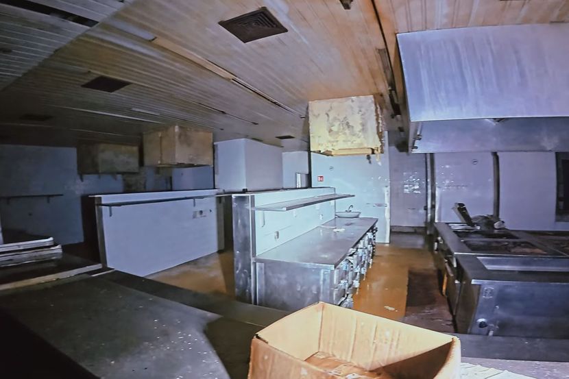 Na snimku je prikazana unutrašnjost kompleksa, koja kao da je zamrznuta u vremenu - ogromna napuštena kuhinja, unutrašnji bazen, hodnici ali i dvorana, sa uredno poređanim stolicama.