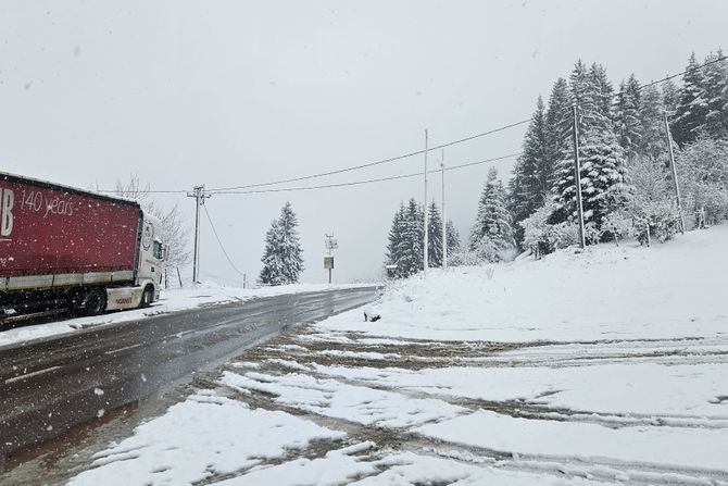 Vlažan sneg zadržava se i na kolovozima, što dodatno otežava saobraćaj u ovim planinskim krajevima.