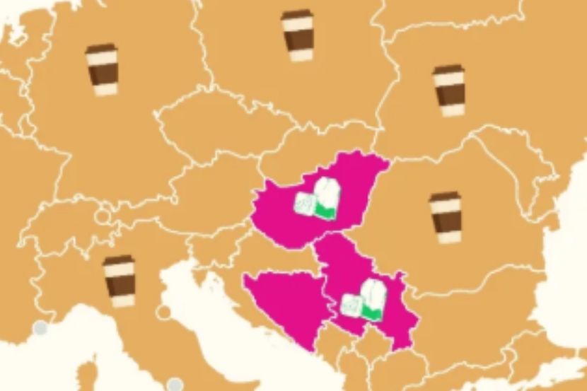 Na karti Evrope koja prikazuje popularnost kafe i čaja, većina kontinenta je obojena smeđom bojom - simbolizujući kafu. Međutim, pravo iznenađenje usledilo je prikazom Srbije, BiH i Mađarske kao nacija koje preferiraju - čaj!