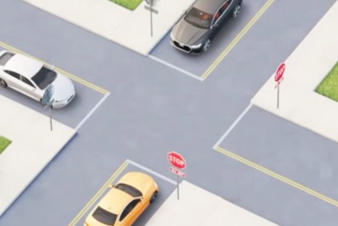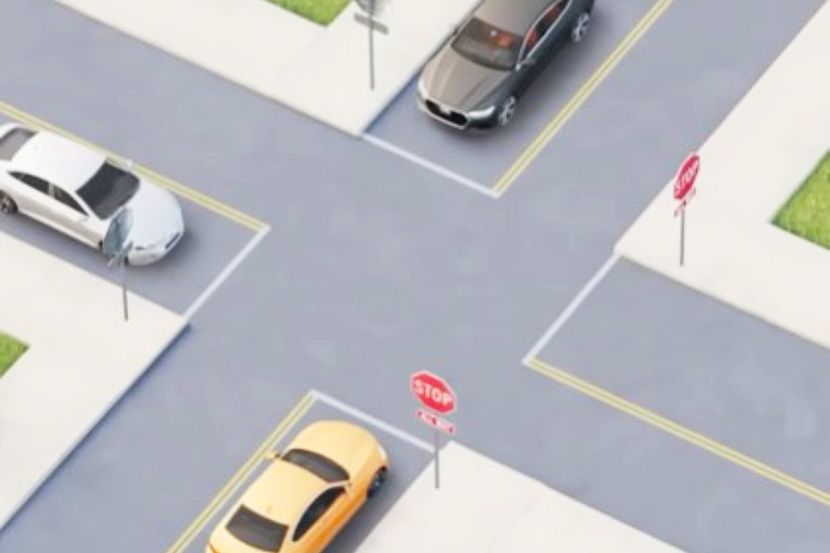 Reč je o ilustraciji raskrsnice na kojoj se nalaze tri automobila - žuti smešten na dnu, beli sa njegove leve strane, kao i sivi koji dolazi s leve strane belog.